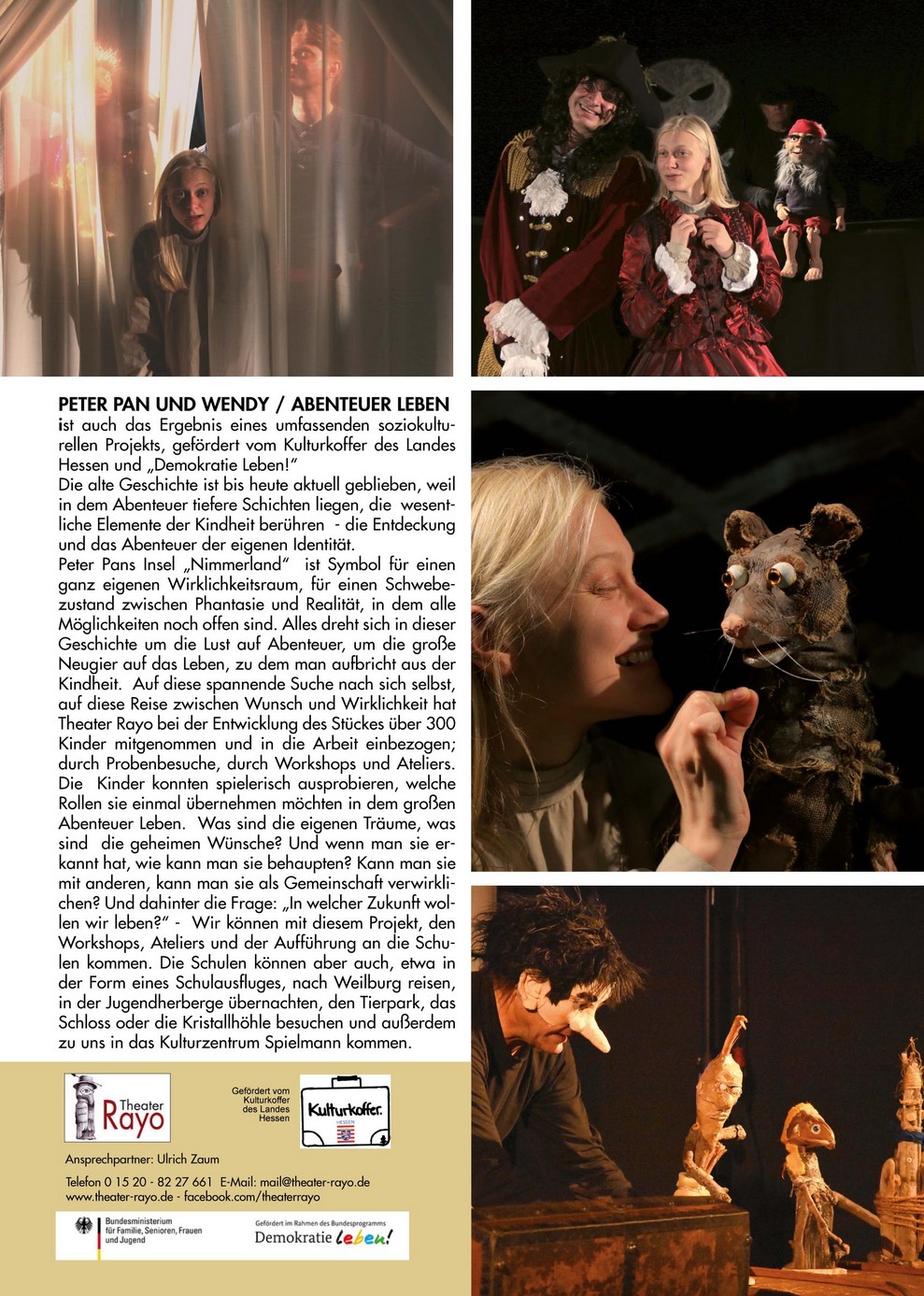 Das Theaterprojekt „Wendy und Peter Pan / Abenteuer leben“, gefördert vom Kulturkoffer des Landes Hessen, entstand in Zusammenarbeit mit 7 Grund- und Förderschulen aus Weilburg und der Region. Kooperationspartner waren u.a. die Kreismusikschule Oberlahn und die Lebenshilfe Wetzlar/Weilburg.